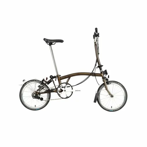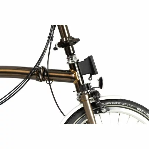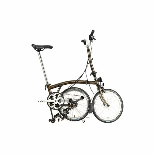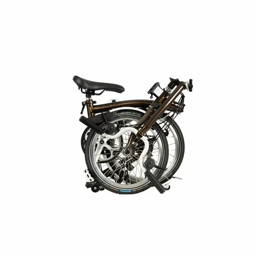 Wheelset: (F) Double-wall rim, 28 spokes laced to a Brompton front hub. (R) Double-wall rim, 28 spokes laced to a Brompton Wide ratio 3 speed internal gear hub with 2 speed external gears (13 and 16 tooth). Giving 6 usable gears with a 300% gear range.
