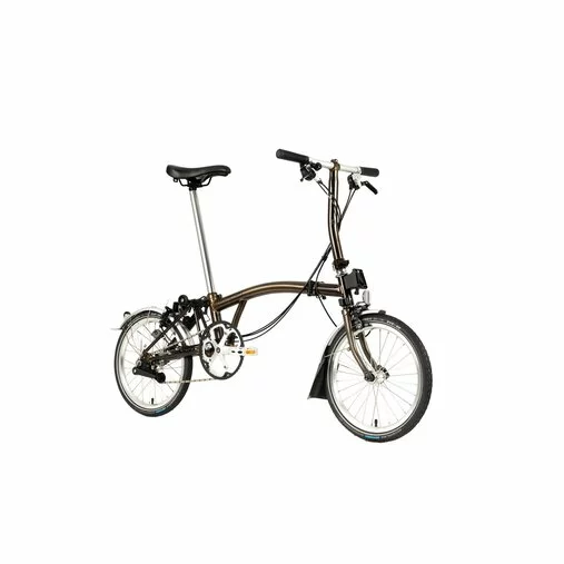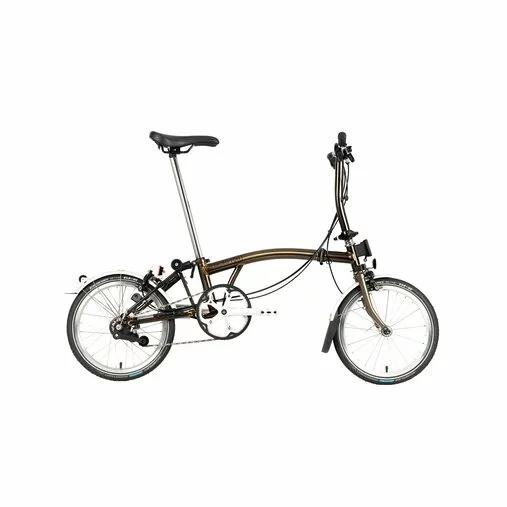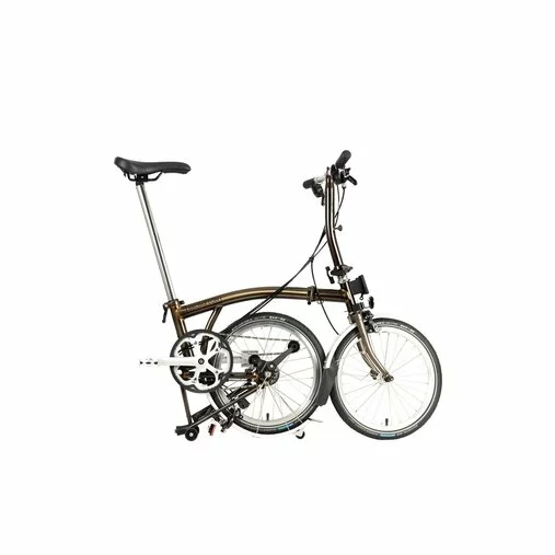 Wheelset: (F) Double-wall rim, 28 spokes laced to a Brompton front hub. (R) Double-wall rim, 28 spokes laced to a Brompton Wide ratio 3 speed internal gear hub with 2 speed external gears (13 and 16 tooth). Giving 6 usable gears with a 300% gear range.
