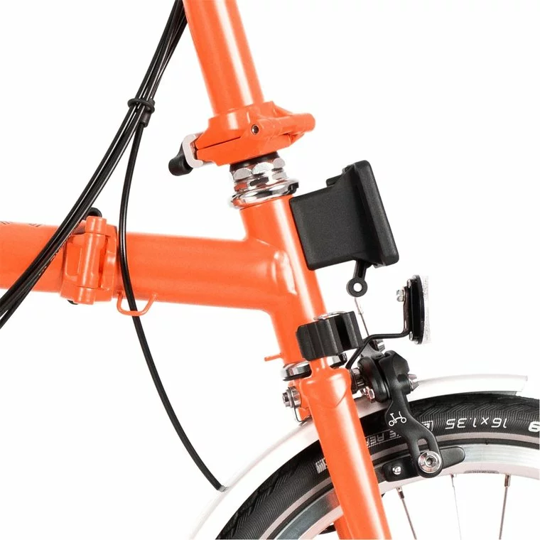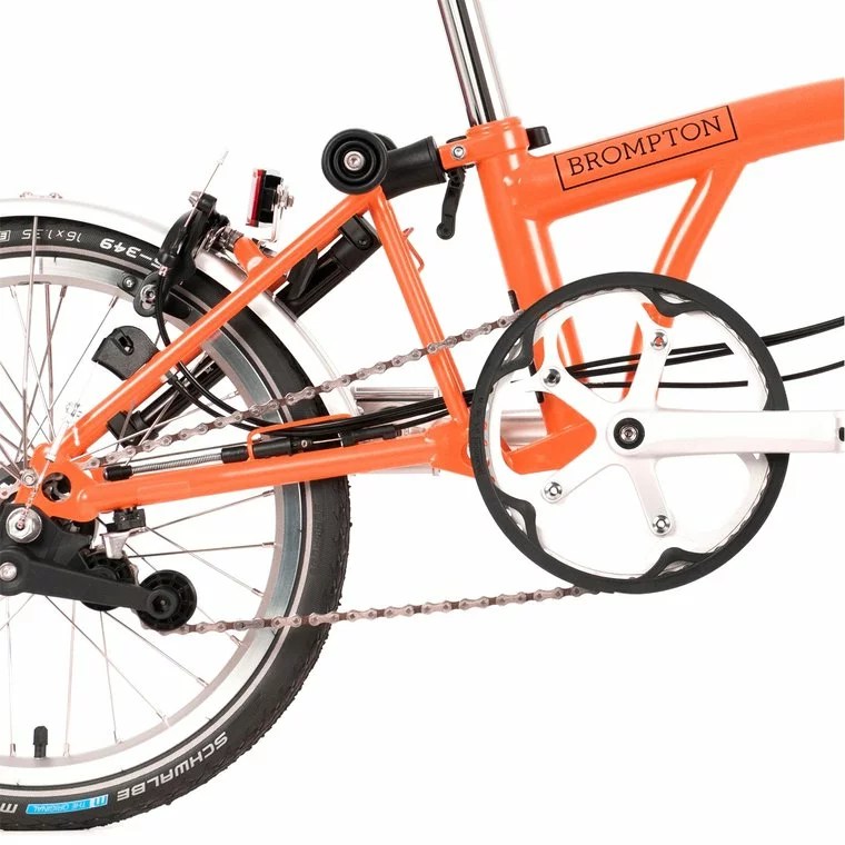 轮组:(F) 双壁轮辋,28 根辐条系在 Brompton 前轮毂上。(R) 双壁轮圈,28 个辐条系在 Brompton 宽速比 3 速内齿轮花鼓上,带 2 速外齿轮(13 和 16 齿)。提供 6 个可用齿轮,齿轮范围为 300%。