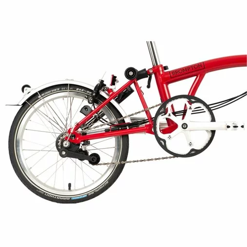 Hubs: (F) Brompton front hub (R) Brompton Wide ratio 3 speed internal gear hub with 2 speed external gears (13 and 16 tooth)