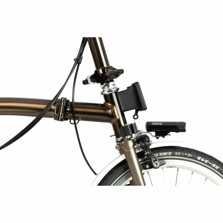 Saddle: Brompton saddle with integrated carry handle (147mm). Incorporates a mount for a Brompton rear light and saddle bag.