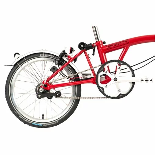 Wheelset: (F) Double-wall rim, 28 spokes laced to a Brompton front hub. (R) Double-wall rim, 28 spokes laced to a Brompton Standard ratio internal 3 speed rear hub with a 13 tooth sprocket. Giving a 177% gear range in a low maintenance package.
